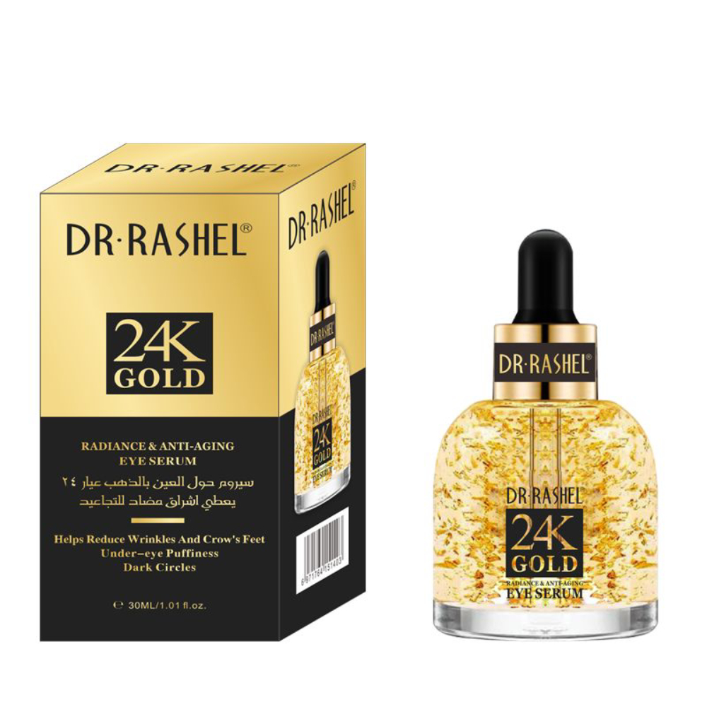 The Dr. Rashel 24K Gold Radiance & Anti-Aging Eye Serum aims to reduce wrinkles, crow’s feet, under-eye puffiness, and dark circles. It is formulated with 24K gold and is designed to provide radiance and an anti-aging effect.