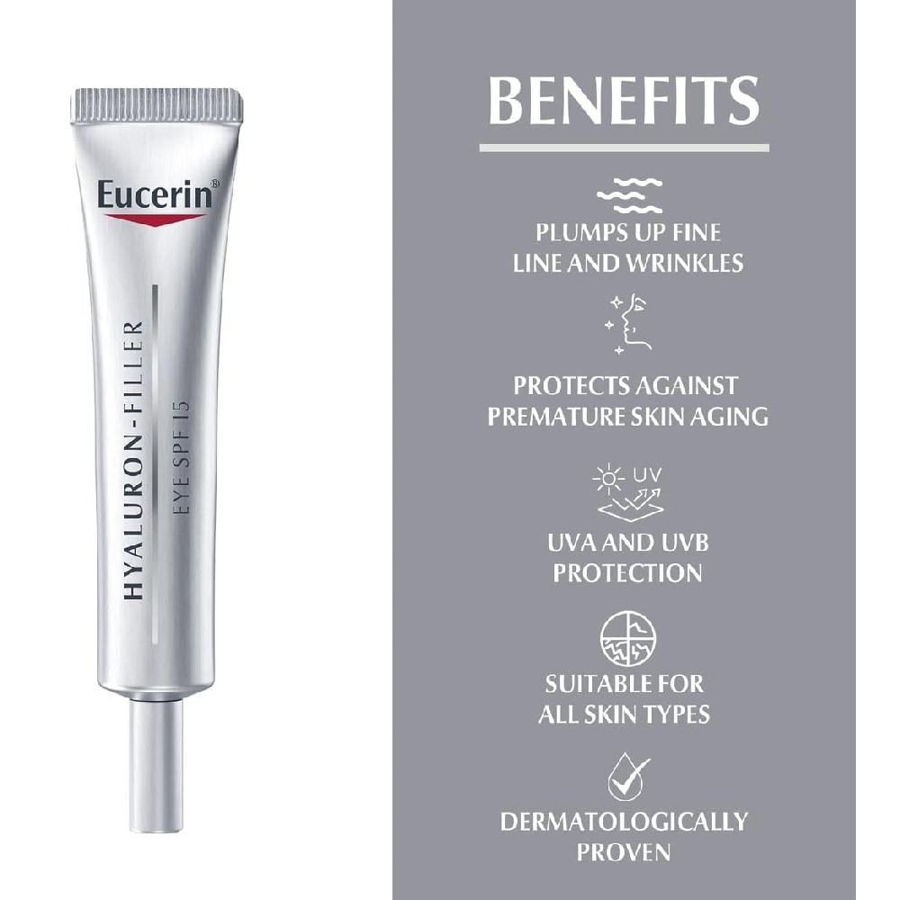 - PLUMPS UP FINE LINES AND WRINKLES: Eucerin Hyaluron Filler Anti-Aging Eye Cream plumps up fine lines and wrinkles in the delicate areas of your eyes and helps visibly reduce their appearance.