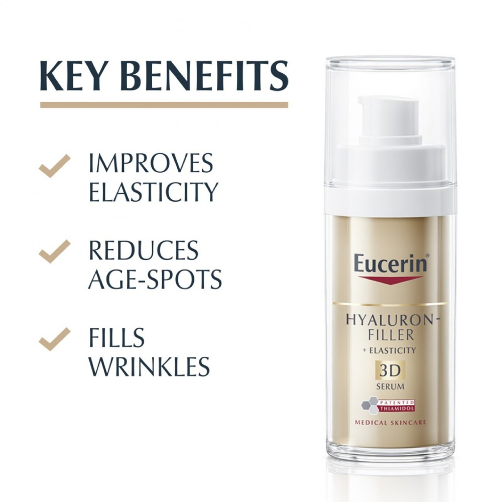 Eucerin Hyaluron-Filler + Elasticity 3D Serum is a light and moisturizing anti-aging serum that effectively treats the 3 Dimensions of skin aging: Loss of elasticity: Our innovative Collagen-Elastin Complex is made up of Creatine and Arctiin, which accelerate collagen renewal in skin cells. It works alongside the Hyaluronic Acid in our formula to improve skin elasticity. Dark spots: The formula includes Thiamidol. Unique to Eucerin, Thiamidol acts at the root cause of hyperpigmentation and is clinically proven to reduce dark spots and, when used regularly, prevents their re-appearance. Wrinkles: As our skin ages, wrinkles deepen. Our innovative blend of high and low molecular Hyaluronic Acid visibly plumps deep wrinkles.
